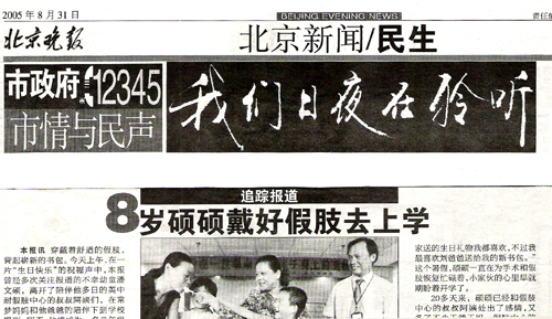 2005年8月31日,[北京晚报]再一次跟踪报道了在北京恩德莱公司装配假肢的小朋友---潘文硕的情况。
