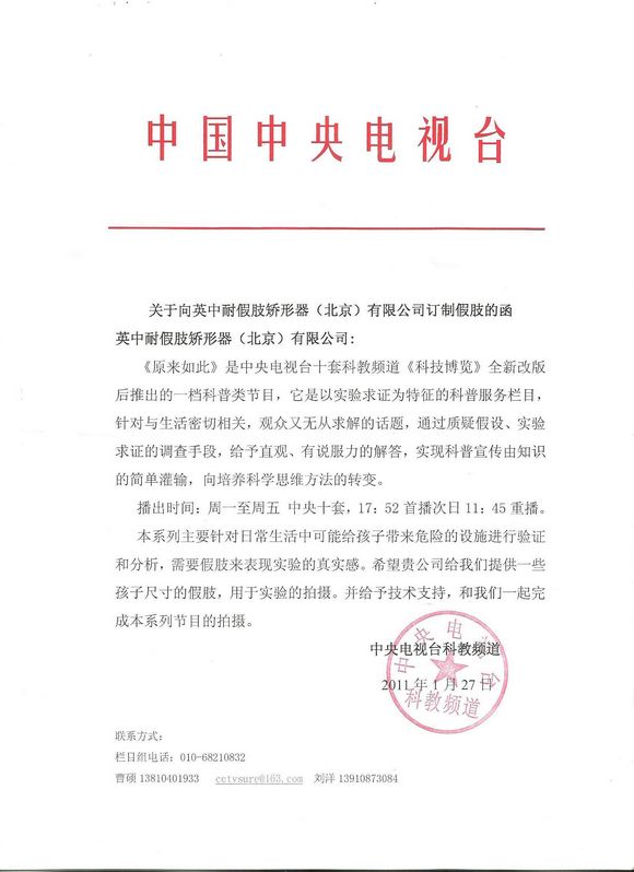 2011年4月18日下午,中央电视台第10套科技频道《科技博览》中《原来如此》 节目摄制组来到北京公司,根据节目科普宣传的内容,对在日常生活中可能给孩子带来危险的设施进行验证和分析,实地拍摄了假肢的表现,进一步验证了假肢的真实感。