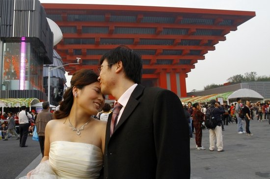 上海世博园中国馆前,盲人志愿者朱国祥亲吻新娘谢丹玲的额头
